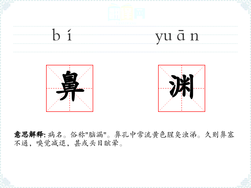 病名。俗称"脑漏"。鼻孔中常流黄色腥臭浊涕。久则鼻塞不通,嗅觉减退,甚或头目眩晕。