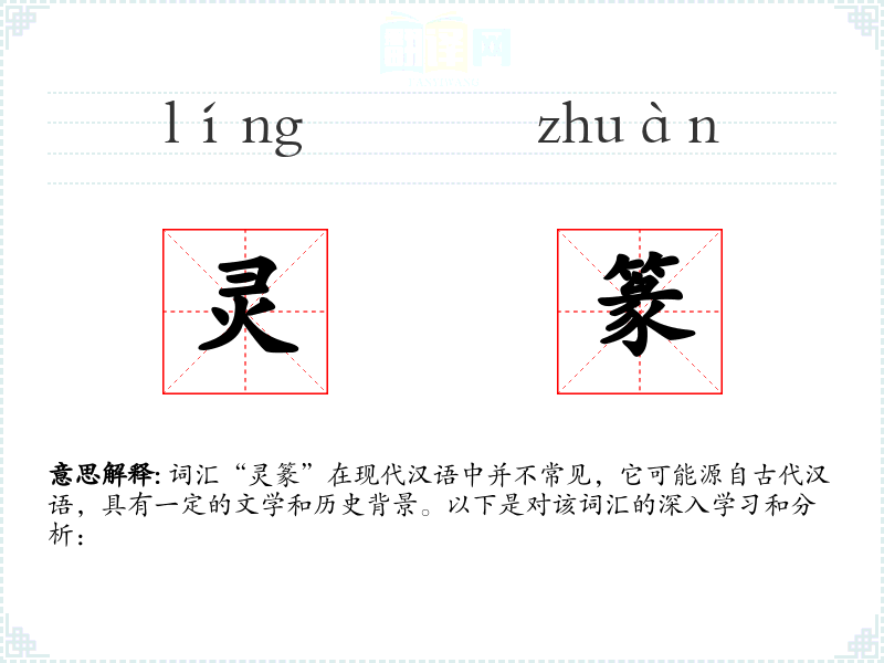 词汇“灵篆”在现代汉语中并不常见,它可能源自古代汉语,具有一定的文学和历史背景。以下是对该词汇的深入学*和分析: