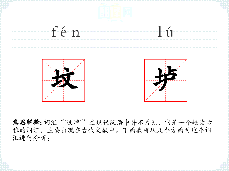 词汇“[坟垆]”在现代汉语中并不常见,它是一个较为古雅的词汇,主要出现在古代文献中。下面我将从几个方面对这个词汇进行分析: