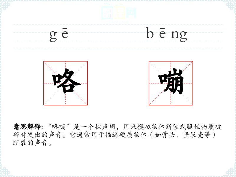 “咯嘣”是一个拟声词,用来模拟物体断裂或脆性物质破碎时发出的声音。它通常用于描述硬质物体(如骨头、坚果壳等)断裂的声音。