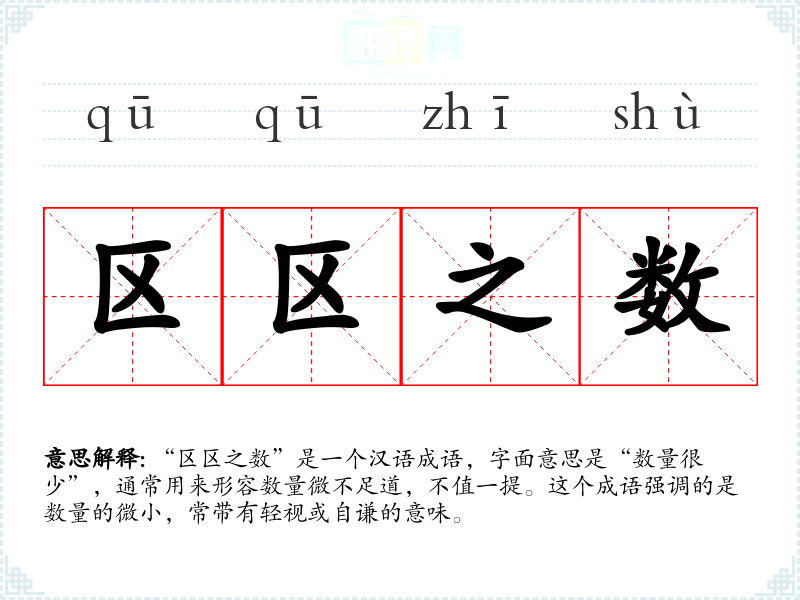 “区区之数”是一个汉语成语,字面意思是“数量很少”,通常用来形容数量微不足道,不值一提。这个成语强调的是数量的微小,常带有轻视或自谦的意味。