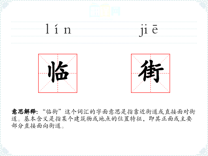 “临街”这个词汇的字面意思是指靠近街道或直接面对街道。基本含义是指某个建筑物或地点的位置特征,即其正面或主要部分直接面向街道。