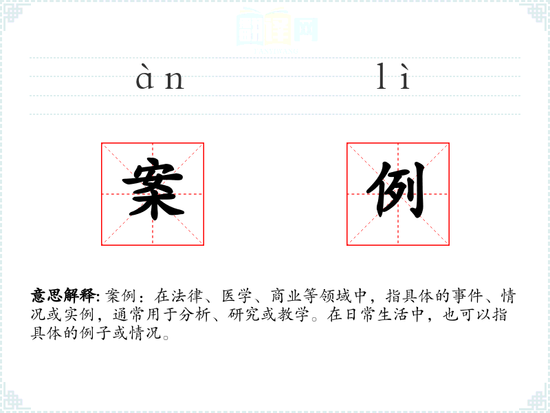 案例:在法律、医学、商业等领域中,指具体的**、情况或实例,通常用于分析、研究或教学。在日常生活中,也可以指具体的例子或情况。