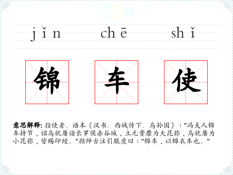 指使者。语本《汉书.西域传下.乌孙国》﹕"冯夫人锦车持节﹐诏乌就屠诣长罗侯赤谷城﹐立元贵靡为大昆弥﹐乌就屠为小昆弥﹐皆赐印绶。"颜师古注引服虔曰﹕"锦车﹐以锦衣车也。"