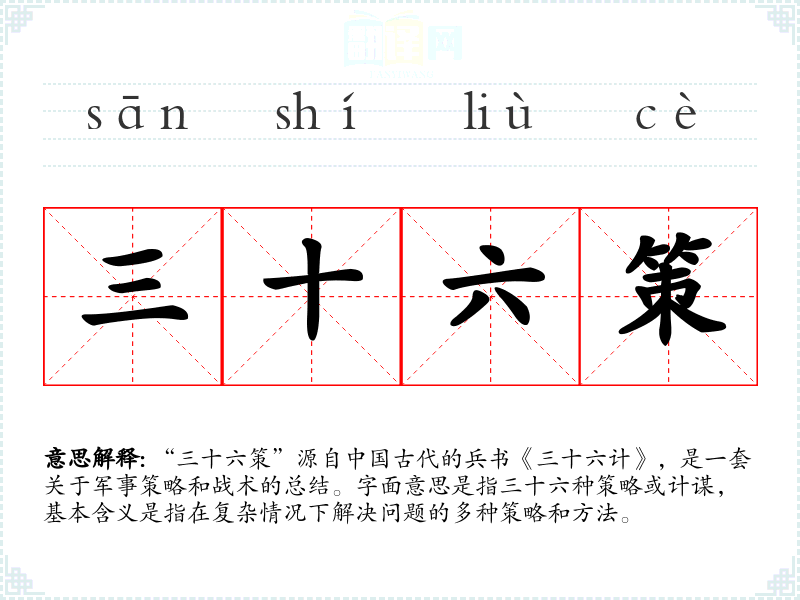 “三十六策”源自**古代的兵书《三十六计》,是一套关于军事策略和战术的总结。字面意思是指三十六种策略或计谋,基本含义是指在复杂情况下解决问题的多种策略和方法。
