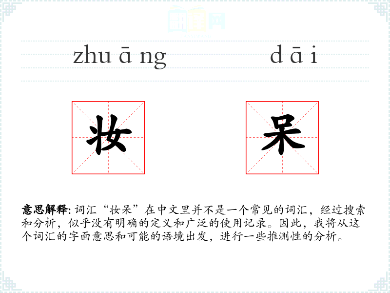 词汇“妆呆”在中文里并不是一个常见的词汇,经过搜索和分析,似乎没有明确的定义和广泛的使用记录。因此,我将从这个词汇的字面意思和可能的语境出发,进行一些推测性的分析。