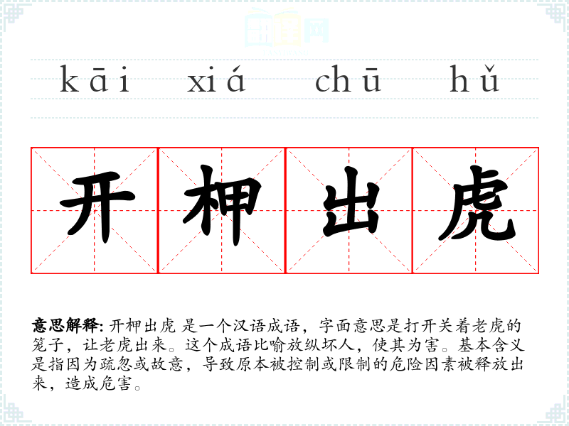 开柙出虎 是一个汉语成语,字面意思是打开关着的笼子,让出来。这个成语比喻放纵坏人,使其为害。基本含义是指因为疏忽或故意,导致原本被控制或限制的危险因素被释放出来,造成危害。