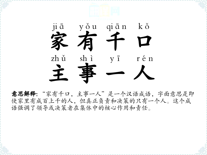 “家有千口,主事一人”是一个汉语成语,字面意思是即使家里有成百上千的人,但真正负责和决策的只有一个人。这个成语强调了领导或决策者在集体中的核心作用和责任。