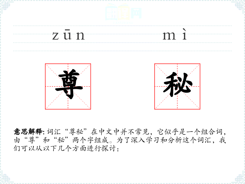 - 词源:尊秘是由“尊”和“秘”两个汉字组合而成,这两个字在中文中都有悠久的历史。