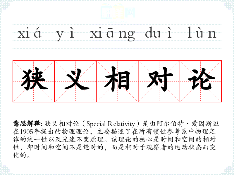 在不同语言中,狭义相对论的翻译基本保持了原意,如在英语中为“Special Relativity”,在法语中为“Relativité restreinte”。这些翻译都准确地传达了理论的核心概念。