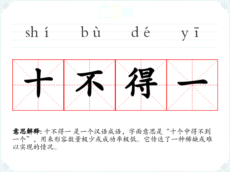 十不得一 是一个汉语成语,字面意思是“十个中得不到一个”,用来形容数量极少或成功率极低。它传达了一种稀缺或难以实现的情况。