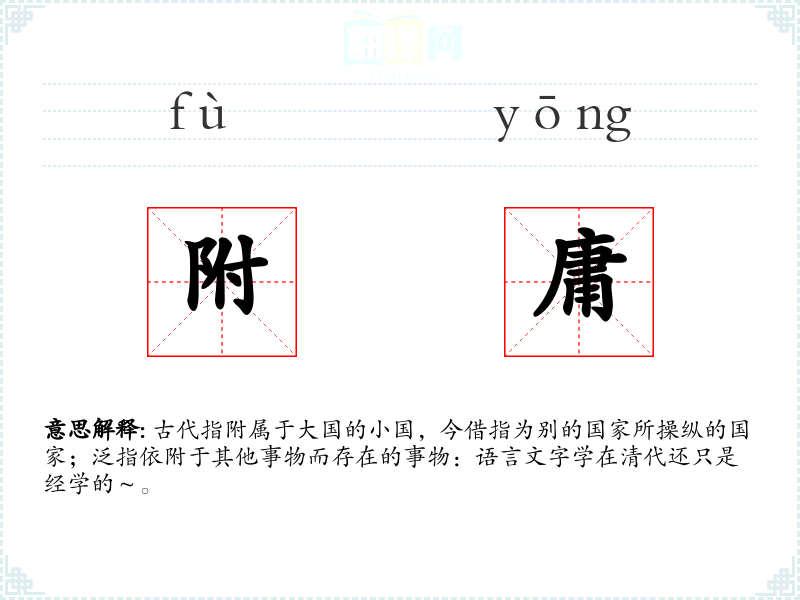 古代指附属于大国的小国,今借指为别的国家所操纵的国家;泛指依附于其他事物而存在的事物:语言文字学在清代还只是经学的~。