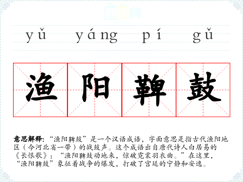 “渔阳鞞鼓”是一个汉语成语,字面意思是指古代渔阳地区(今河北省一带)的战鼓声。这个成语出自唐代诗人白居易的《长恨歌》:“渔阳鞞鼓动地来,惊破霓裳羽衣曲。”在这里,“渔阳鞞鼓”象征着战争的爆发,打破了宫廷的宁静和安逸。