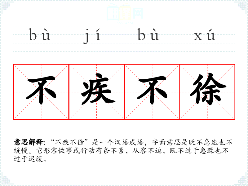 “不疾不徐”是一个汉语成语,字面意思是既不急速也不缓慢。它形容做事或行动有条不紊,从容不迫,既不过于急躁也不过于迟缓。