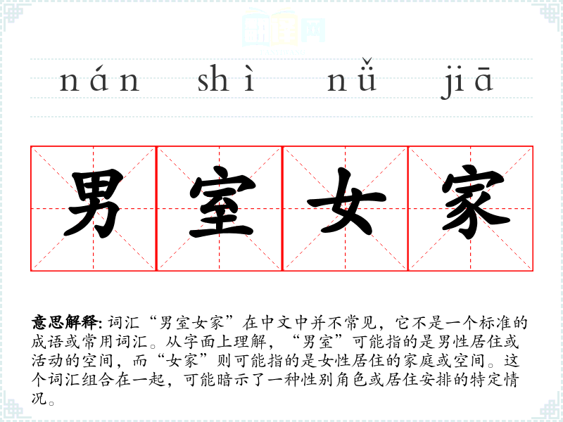 词汇“男室女家”在中文中并不常见,它不是一个标准的成语或常用词汇。从字面上理解,“男室”可能指的是男性居住或活动的空间,而“女家”则可能指的是女性居住的家庭或空间。这个词汇组合在一起,可能暗示了一种性别角色或居住安排的特定情况。
