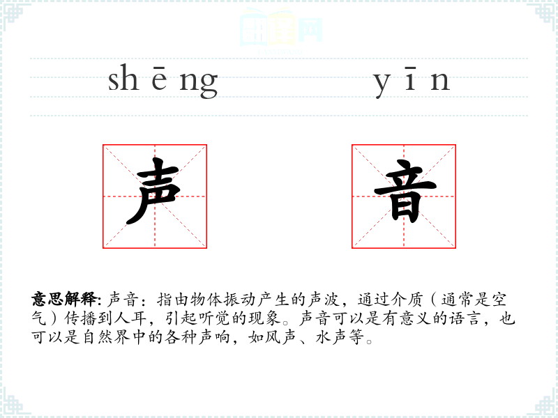 声音:指由物体振动产生的声波,通过介质(通常是空气)传播到人耳,引起听觉的现象。声音可以是有意义的语言,也可以是自然界中的各种声响,如风声、水声等。