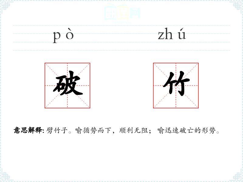 劈竹子。喻循势而下,顺利无阻; 喻迅速破亡的形势。