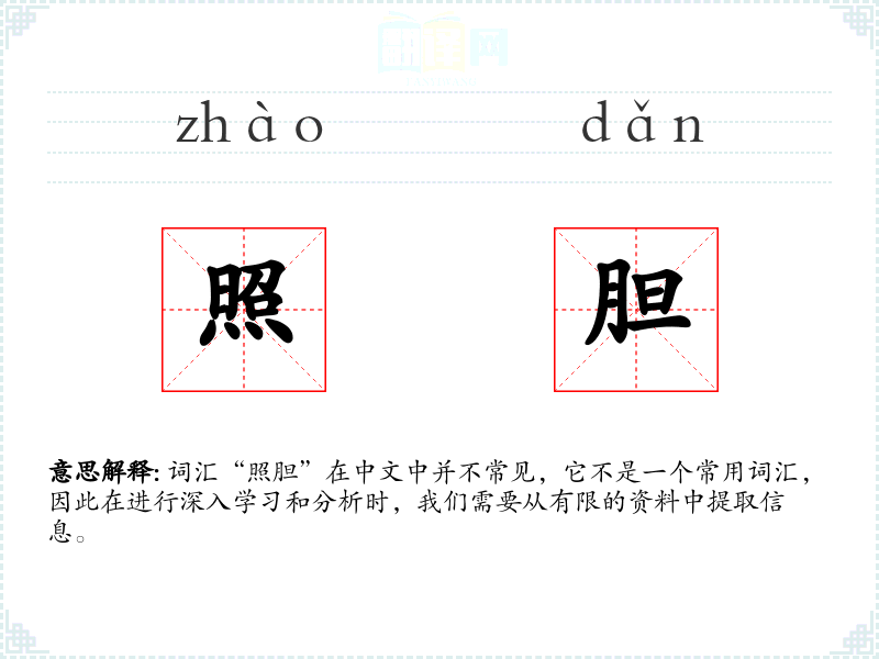 词汇“照胆”在中文中并不常见,它不是一个常用词汇,因此在进行深入学*和分析时,我们需要从有限的资料中提取信息。