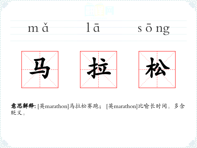 [英marathon]马拉松赛跑; [英marathon]比喻长时间。多含贬义。