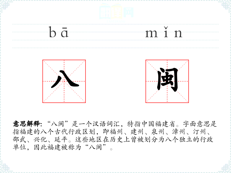 “八闽”是一个汉语词汇,特指**福建省。字面意思是指福建的八个古代行政区划,即福州、建州、泉州、漳州、汀州、邵武、兴化、延平。这些地区在历史上曾被划分为八个独立的行政单位,因此福建被称为“八闽”。