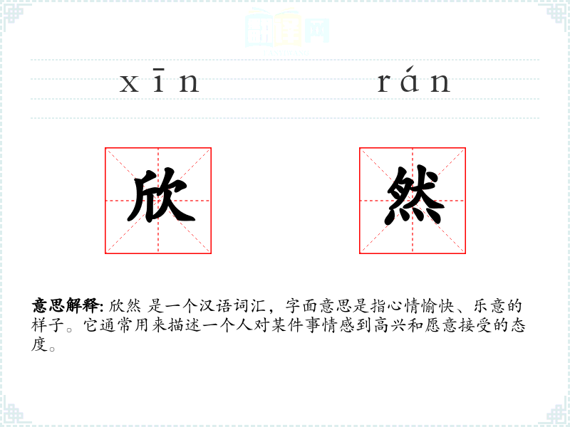 欣然 是一个汉语词汇,字面意思是指心情愉快、乐意的样子。它通常用来描述一个人对某件事情感到高兴和愿意接受的态度。