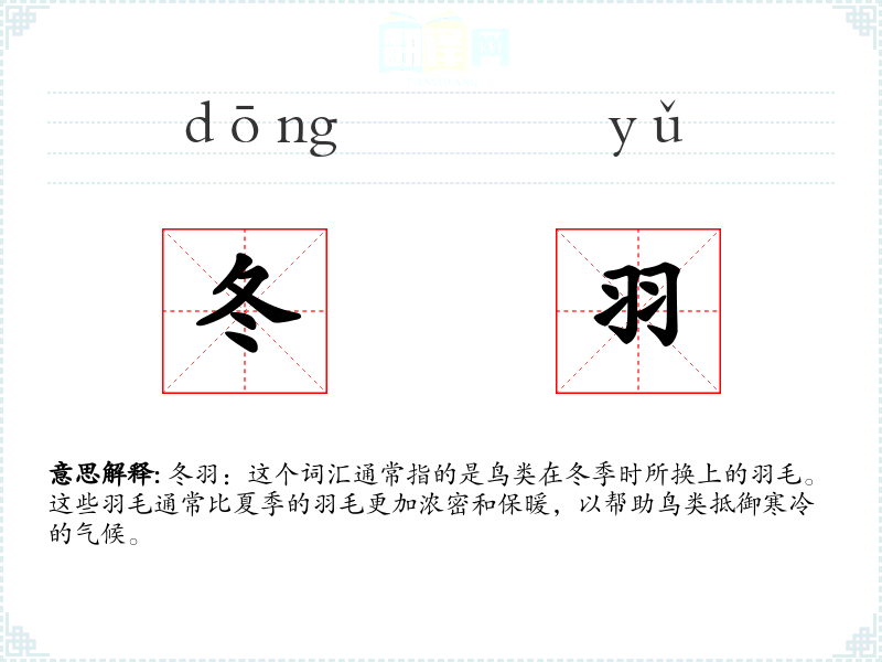 “冬羽”这个词由“冬”和“羽”两个字组成。在古代汉语中,“冬”指的是一年中的第四个季节,而“羽”则是指鸟类的羽毛。这个词汇在汉语中一直用来描述鸟类在冬季的羽毛特征。