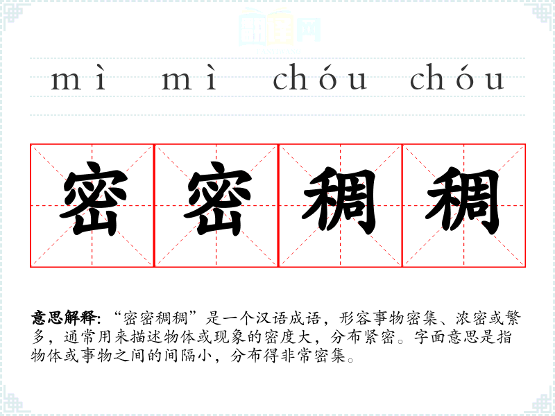 “密密稠稠”这个词汇的词源较为直接,由“密密”和“稠稠”两个形容词叠加而成,强调了事物的密集程度。在汉语中,这种叠词的使用可以增强表达的力度和形象性。