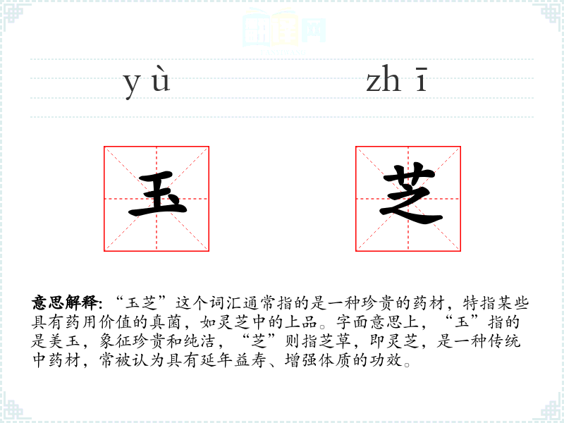 在文学作品中,“玉芝”常被用来象征长寿、健康和吉祥。在口语中,这个词汇可能不太常用,但在中医或药材相关的专业领域,它是一个专业术语。