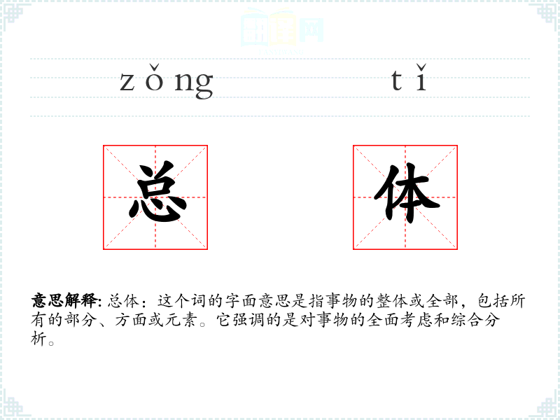 总体:这个词的字面意思是指事物的整体或全部,包括所有的部分、方面或元素。它强调的是对事物的全面考虑和综合分析。