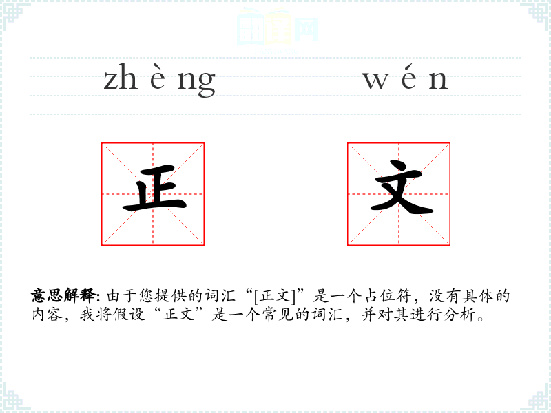 由于您提供的词汇“[正文]”是一个占位符,没有具体的内容,我将假设“正文”是一个常见的词汇,并对其进行分析。