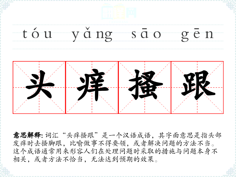 词汇“头痒搔跟”是一个汉语成语,其字面意思是指头部发痒时去搔脚跟,比喻做事不得要领,或者解决问题的方法不当。这个成语通常用来形容人们在处理问题时采取的措施与问题本身不相关,或者方法不恰当,无法达到预期的效果。