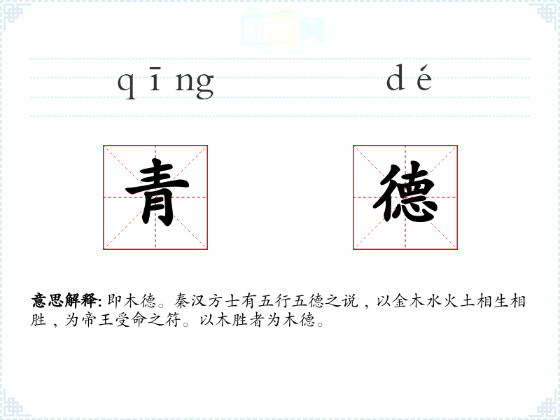 即木德。秦汉方士有五行五德之说﹐以金木水火土相生相胜﹐为帝王受命之符。以木胜者为木德。