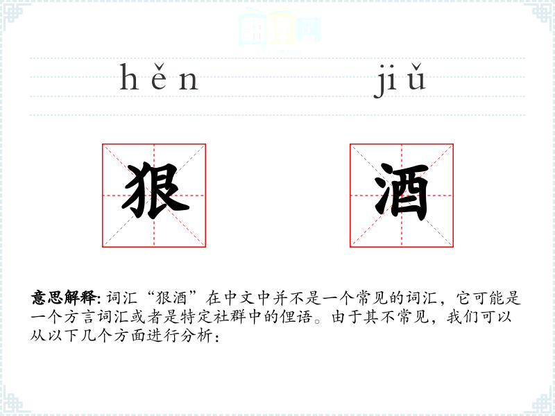 词汇“狠酒”在中文中并不是一个常见的词汇,它可能是一个方言词汇或者是特定社群中的俚语。由于其不常见,我们可以从以下几个方面进行分析: