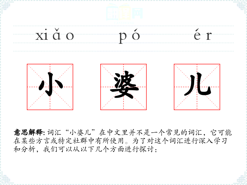 “小婆儿”这个词汇在中文中并不常见,它可能在某些方言或特定社群中有所使用。了解这个词汇有助于我们理解地方文化和特定社群的语言惯。在语言学和表达中,了解这样的词汇可以增加我们对语言多样性的认识。