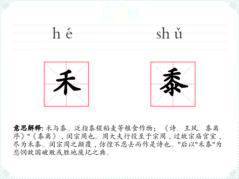 1.禾与黍。泛指黍稷稻麦等粮食作物; 《诗.王风.黍离序》"《黍离》﹐闵宗周也。周大夫行役至于宗周﹐过故宗庙宫室﹐尽为禾黍。闵宗周之颠覆﹐仿徨不忍去而作是诗也。"后以"禾黍"为悲悯故国破败或胜地废圮之典。