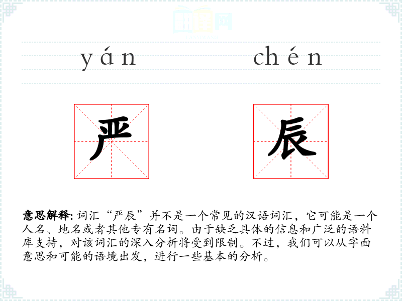 词汇“严辰”并不是一个常见的汉语词汇,它可能是一个人名、地名或者其他专有名词。由于缺乏具体的信息和广泛的语料库支持,对该词汇的深入分析将受到限制。不过,我们可以从字面意思和可能的语境出发,进行一些基本的分析。