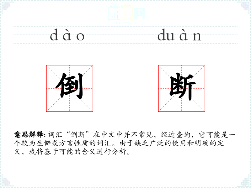 词汇“倒断”在中文中并不常见,经过查询,它可能是一个较为生僻或方言性质的词汇。由于缺乏广泛的使用和明确的定义,我将基于可能的含义进行分析。