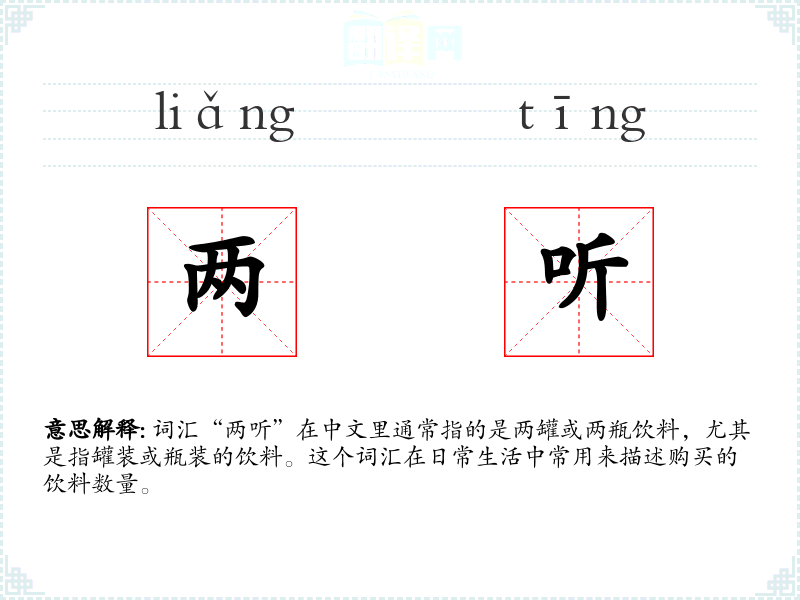 词汇“两听”在中文里通常指的是两罐或两瓶饮料,尤其是指罐装或瓶装的饮料。这个词汇在日常生活中常用来描述购买的饮料数量。