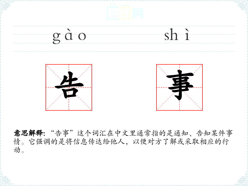 “告事”这个词汇在中文里通常指的是通知、告知某件事情。它强调的是将信息传达给他人,以便对方了解或采取相应的行动。