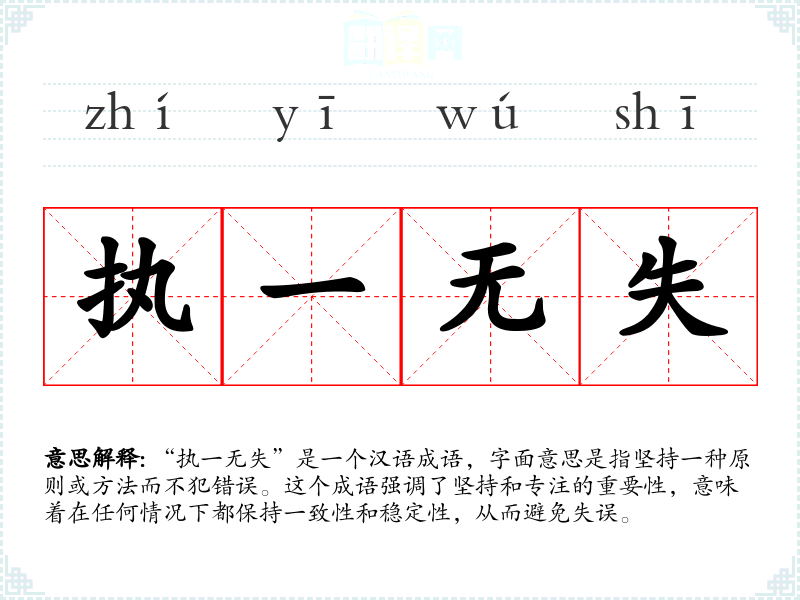 “执一无失”是一个汉语成语,字面意思是指坚持一种原则或方法而不犯错误。这个成语强调了坚持和专注的重要性,意味着在任何情况下都保持一致性和稳定性,从而避免失误。