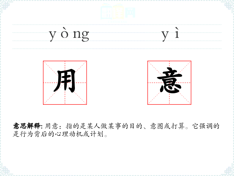 用意一词源自汉语,由“用”和“意”两个字组成。在古代汉语中,“用”指使用、利用,“意”指心思、想法。随着语言的发展,这两个字结合形成了表示目的或意图的词汇。