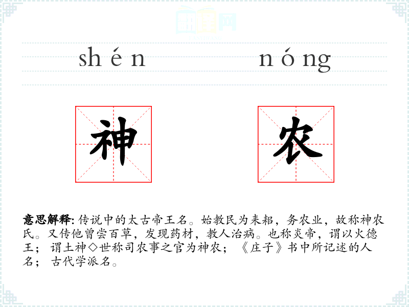 传说中的太古帝王名。始教民为耒耜,务农业,故称神农氏。又传他曾尝百草,发现药材,教人治病。也称炎帝,谓以火德王; 谓土神◇世称司农事之官为神农; 《庄子》书中所记述的人名; 古代学派名。