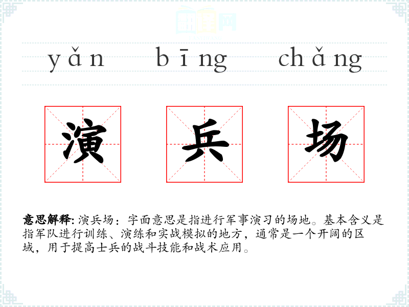 - 专业领域:在军事领域,演兵场是一个专业术语,用于指代特定的训练设施。