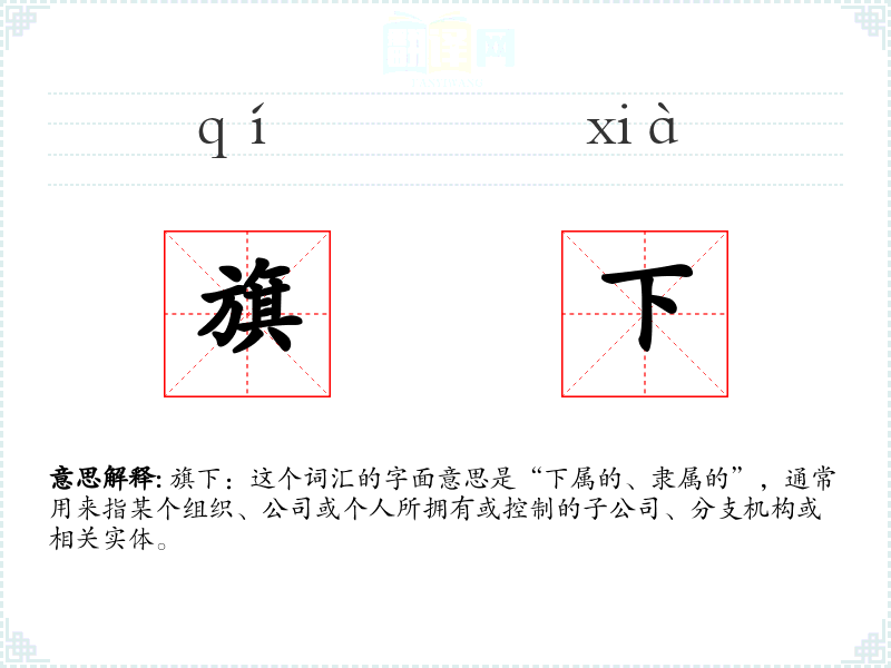 旗下:这个词汇的字面意思是“下属的、隶属的”,通常用来指某个组织、公司或个人所拥有或控制的子公司、分支机构或相关实体。