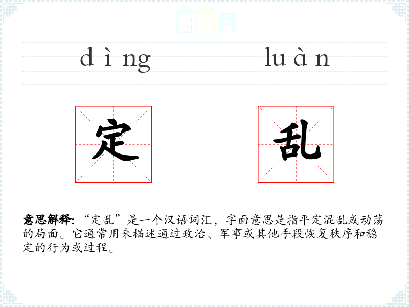 “定乱”是一个汉语词汇,字面意思是指平定混乱或动荡的局面。它通常用来描述通过政治、军事或其他手段恢复秩序和稳定的行为或过程。