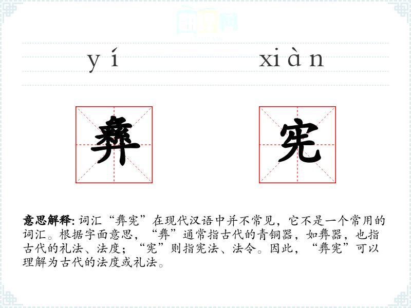 由于“彝宪”不是一个常用词汇,它在现代文学、口语或专业领域中很少出现。在历史学或考古学领域,可能会用来指代古代的法律制度。