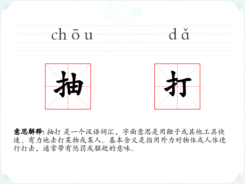 抽打 是一个汉语词汇,字面意思是用鞭子或其他工具快速、有力地击打某物或某人。基本含义是指用外力对物体或人体进行打击,通常带有惩罚或驱赶的意味。