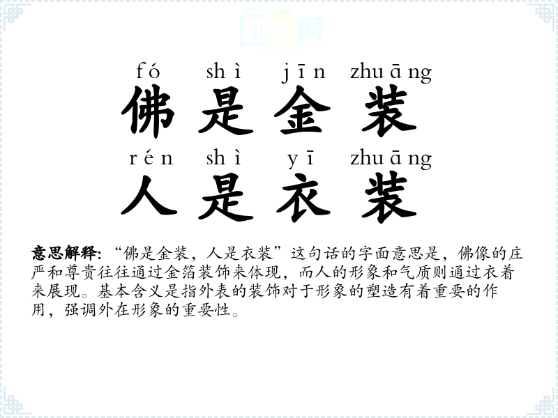 “佛是金装,人是衣装”这句话的字面意思是,佛像的庄严和尊贵往往通过金箔装饰来体现,而人的形象和气质则通过衣着来展现。基本含义是指外表的装饰对于形象的塑造有着重要的作用,强调外在形象的重要性。