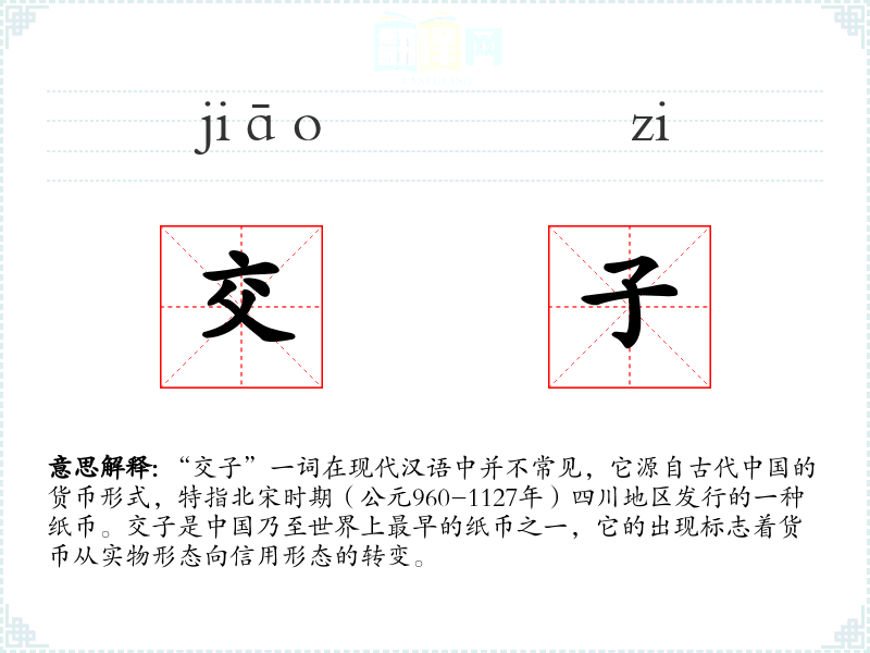 在文学作品中,“交子”可能被用来象征古代经济的发展或货币制度的变迁。在口语或日常交流中,这个词可能不太常用,除非是在讨论历史或金融话题时。在专业领域,如经济学、历史学,交子是一个重要的研究对象,用于探讨古代货币制度和经济发展。