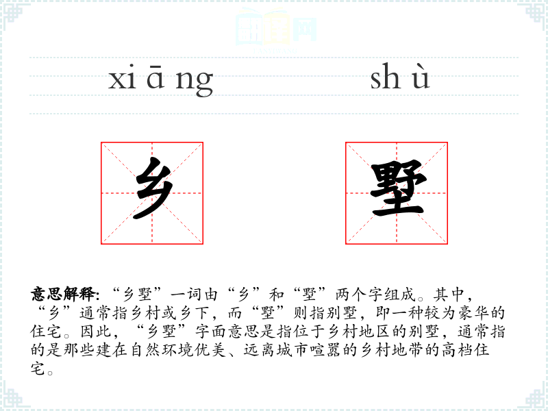 “乡墅”一词由“乡”和“墅”两个字组成。其中,“乡”通常指乡村或乡下,而“墅”则指别墅,即一种较为豪华的住宅。因此,“乡墅”字面意思是指位于乡村地区的别墅,通常指的是那些建在自然环境优美、远离城市喧嚣的乡村地带的高档住宅。